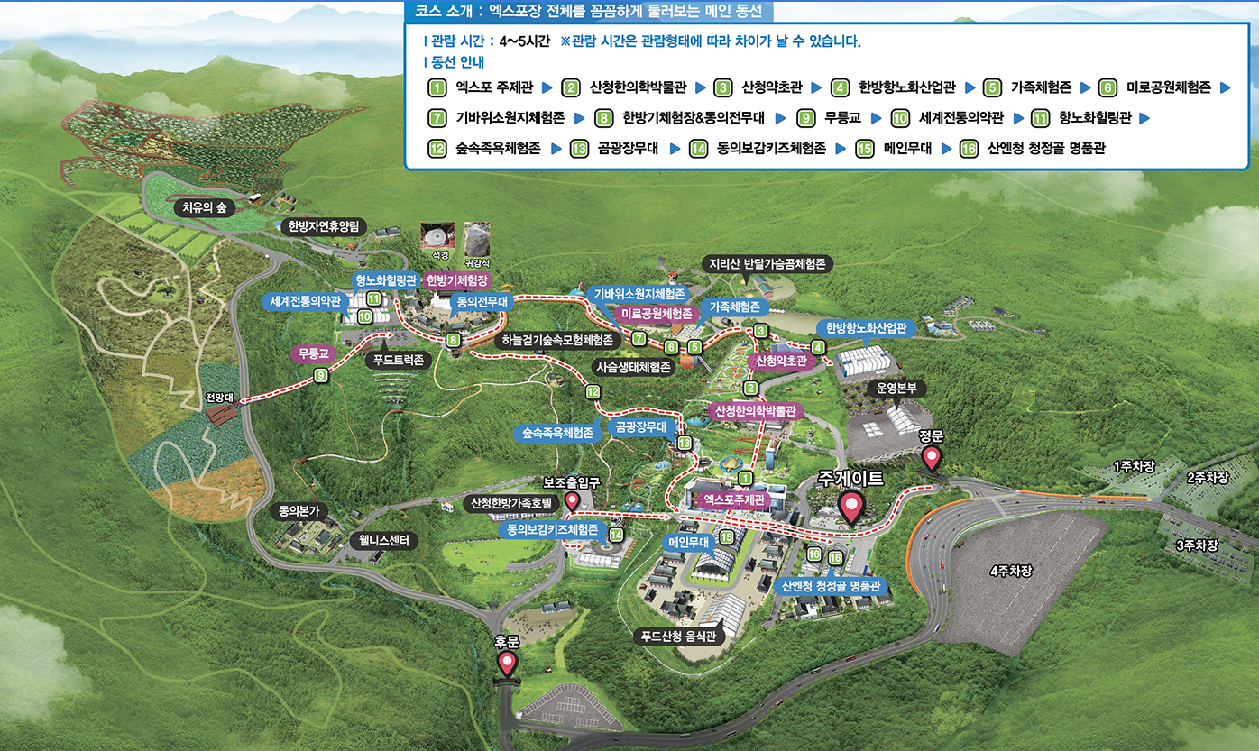 엑스포 주제관 → 산청한의학박물관 → 산청약초관 → 한방 항노화산업관 → 가족체험존 → 미로공원체험존 → 기바위소원지 체험존 → 한방기체험장&동의전 무대 → 무릉교→ 세계전통의약관 → 항노화힐링관 → 숲속족욕체험존 → 곰광장무대 → 동의보감키즈체험전 → 메인무대 → 산엔청 청절골 명품관