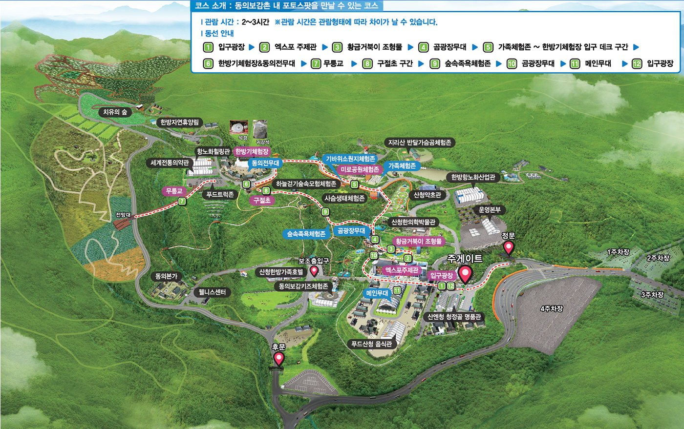 입구광장 → 엑스포 주제관 → 황금거북이 조형물 → 곰광장무대 → 가족체험존 ~ 한방기체험장 입구 데크 구간 → 한방기체험장 &동의전무대 → 무릉교 → 구절초 구간 → 숲속족욕체험존 → 곰광장무대 → 메인무대 → 입구광장