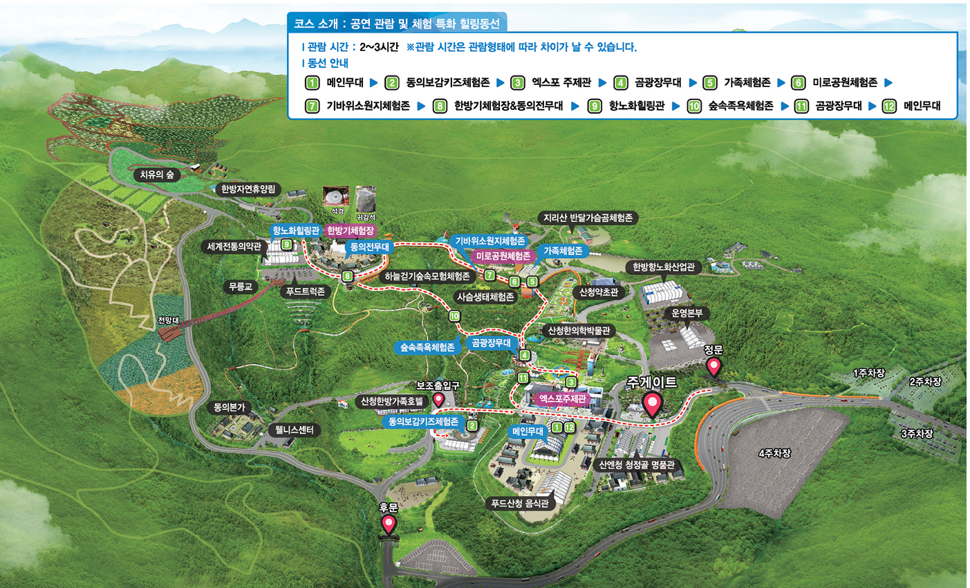 메인무대 → 동의보감키즈체험존 → 엑스포주제관 → 곰광장무대 → 가족체험존 → 미로공원체험존 → 기바위소원지 체험존 → 한방기 체험장 &동의전무대 → 항노화힐링관 → 숲속족욕체험존 → 곰광장무대 → 메인무대